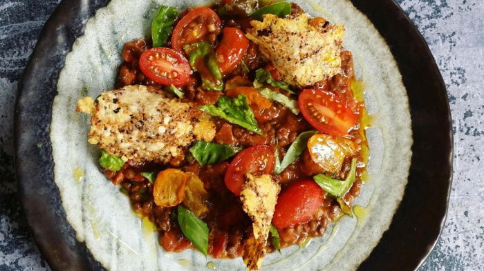 The saucy lentils and Grana Padano create the type of texture associated with risotto and the taste associated with Bolognaise sauce, but they do it in 6 minutes rather than 20. Once you’ve got this Lentilzotto in your repertoire you can take it beyond the almost instant meal as it can become a base for any recipe that uses savoury mince; think lasagne, moussaka, chilli or anywhere your imagination takes you. If you can’t find the pouch, I have included a recipe for lentil Bolognaise that gives you roughly the same result. For a touch of glamour you can serve this with Grana Padano tuiles.